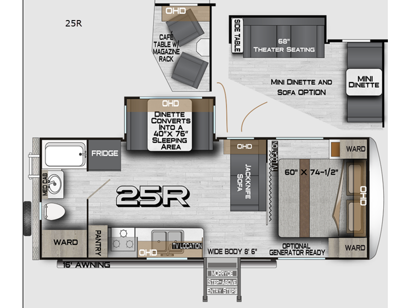 Sleeps 5 Slides 1 Length 27 ft 3 in Ext Width 8 ft 6 in Ext Height 11 ft 7 in Interior Color Moonstone, Carbon Hitch Weight 711 lbs GVWR 10700 lbs Dry Weight 6609 lbs Cargo Capacity 4091 lbs Fresh Water Capacity 63 gals Grey Water Capacity 44 gals Black Water Capacity 35 gals Tire Size ST225/75R15E Furnace BTU 25000 btu Available Beds RV Queen Refrigerator Type 12V Refrigerator Size 10 cu ft Cooktop Burners 3 Number of Awnings 1 Axle Weight 5898 lbs LP Tank Capacity 30 Water Heater Capacity 10 gal Water Heater Type DSI Gas/Electric Quick Recovery AC BTU 13500 btu TV Info LR 32" 12V LED TV Awning Info 12V LED w/Adjustable Pitch Axle Count 2 Number of LP Tanks 2 Shower Type Tub/Shower Combo Electrical Service 30 amp Similar Travel Trailer Floorplans