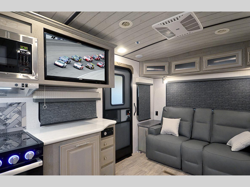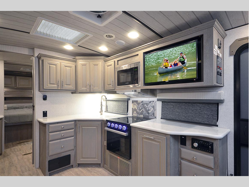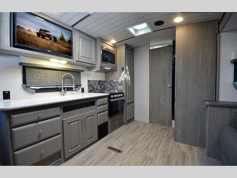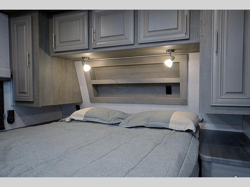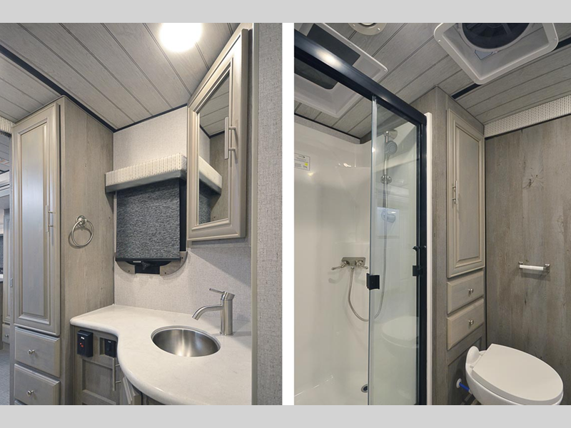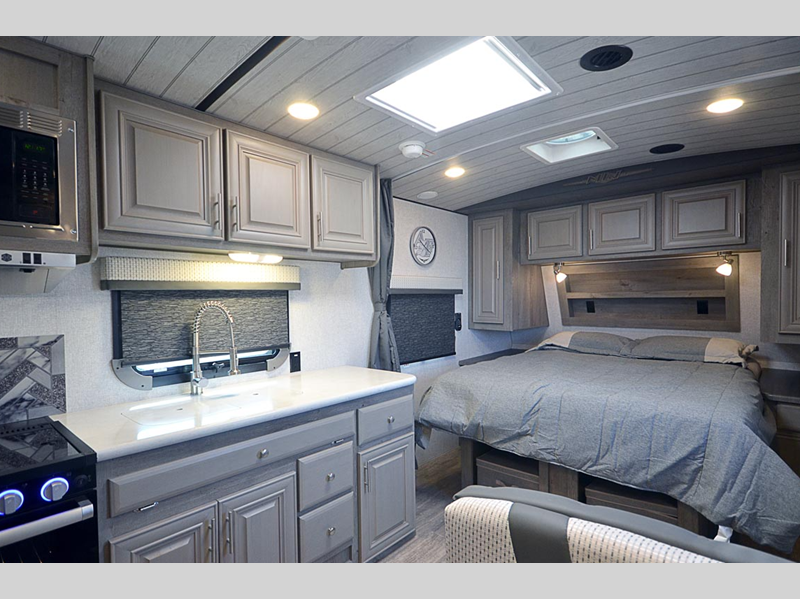 Sleeps 4 Slides 2 Length 30 ft 7 in Ext Width 8 ft 6 in Ext Height 11 ft 4 in Interior Color Moonstone, Carbon, Kona Hitch Weight 1005 lbs GVWR 12800 lbs Dry Weight 8040 lbs Cargo Capacity 4760 lbs Fresh Water Capacity 100 gals Grey Water Capacity 90 gals Black Water Capacity 55 gals Tire Size ST235/85R16 Furnace BTU 30000 btu Available Beds King Refrigerator Type 12V Refrigerator Size 10 cu ft Cooktop Burners 3 Number of Awnings 1 Axle Weight 7235 lbs LP Tank Capacity 30 Water Heater Capacity 10 gal Water Heater Type Gas/Elect Quick Recovery AC BTU 13500 btu TV Info BR 32" 12V LED TV Awning Info 16' LED w/Adjustable Pitch & Weatherguard Axle Count 2 Number of LP Tanks 2 Shower Type Neo-Angled Similar Floorplans